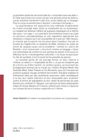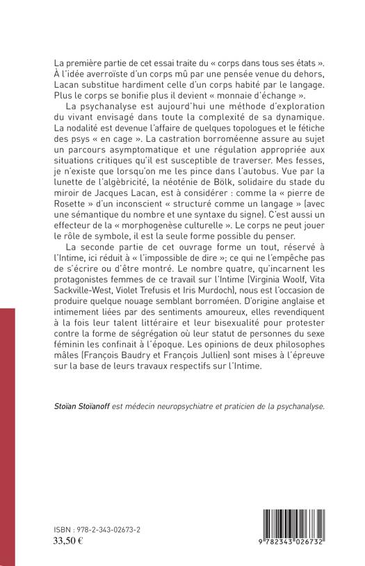 L'auteur Stoïan Stoïanoff, médecin neuropsychiatre et praticien de la psychanalyse, traite dans cet essai du "corps dans tous ses états", d'un corps "habité par le langage" (Lacan). Dans cet ouvrage, les opinions de deux philosophes (François Baudry et François Jullien) sont mises à l'épreuve sur la base de leurs travaux respectifs sur l'Intime.