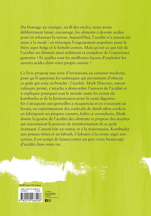 Ce livre propose une série d’invitations au cuisinier moderne, pour qu’il apprenne les techniques qui permettent d’obtenir ce goût qui reste en bouche : l’acidité. Mark Diacono, auteur culinaire primé, s’attache à démystifier l’univers de l’acidité et à expliquer pourquoi tout le monde vante les vertus du kombucha et de la fermentation pour la santé digestive.En s’attaquant aux groseilles à maquereau et en s’essayant au levain, en expérimentant des cocktails de shrub ultra-cools et en fabriquant ses propres yaourts, kéfirs et cornichons, Mark donne la genèse de l’acidité des aliments et propose des recettes qui maximisent le pouvoir de transformation de ce goût étonnant. Canard rôti au sumac et à la mayonnaise, Kombucha aux prunes rôties et au labneh, Clafoutis à la crème aigre aux cerises, il est temps de laisser entrer un peu (voire beaucoup) d’acidité dans votre vie.