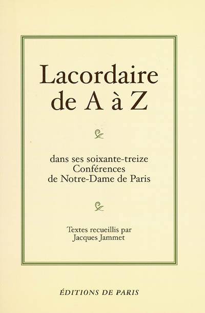 "De ""Adam"" à ""Vieillesse"", l'exposé de la doctrine catholique par Lacordaire . Jean-Baptiste Lacordaire (1802-1861) est avocat lorsqu'il entre, touché par la grâce, avec Lamennais et Montalembert, au séminaire Saint-Sulpice. Il fonde avec eux le journal L'Avenir. Après la condamnation de Lamennais par Grégoire XVI, il s'en éloigne et publie ses Considérations sur le système philosophique de M. de Lamennais (1843). Apôtre de la jeunesse étudiante, il donne en 1835-1836 ses célèbres conférences à Notre-Dame de Paris, qui attirent un vaste public. On mesurera, dans le présent ouvrage, la diversité des thèmes, leur actualité et l'éloquence du prédicateur. Après cinq années de recueillement à Rome, Lacordaire entre chez les Dominicains (1839) puis reprend les Conférences de Notre-Dame pendant douze ans. En 1843, il rétablit, en France, l'ordre dominicain, d'où la Révolution l'avait chassé et lance, avec Frédéric Ozanam, L'Ère nouvelle qui met l'accent sur la question sociale. Un moment député (1848), il consacre ses dernières forces à la direction de son Ordre et à celle du collège de Sorèze (Tarn), où il poursuit son uvre d'éducation (Lettres à un jeune homme sur la vie chrétienne, 1858). Il est élu à l'Académie française en 1860. Textes recueillis par Jacques Jammet"