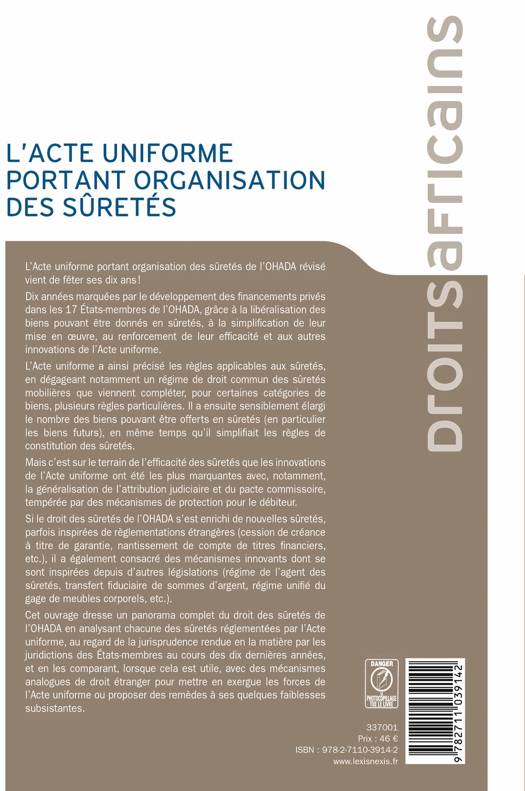 Une première édition de cet ouvrage avait été publiée en 2012 par les éditions Lamy, sous la direction du professeur Pierre Crocq. La deuxième édition, publiée sous la direction scientifique du professeur Jean-Jacques Ansault, réunit plusieurs auteurs spécialistes du droit des sûretés de l'OHADA (Alex Bebe-Epale, Michel Brizoua-Bi, Olivier Fille-Lambie, Louis-Jérôme Laisney, Arianne Marceau-Cotte et Alexandre Salem). Cet ouvrage, préfacé par le professeur Sibidi Emmanuel Darankoum, secrétaire permanent de l'OHADA, s'articule autour de quatre grands axes : une première partie présentant les grandes orientations et le rayonnement de l'Acte uniforme portant organisation des sûretés, une deuxième partie décrivant la nomination, les pouvoirs et obligations de l'agent des sûretés et enfin les deux dernières parties consacrées aux sûretés personnelles et aux sûretés réelles.