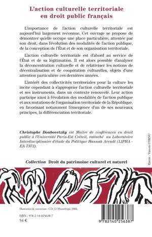 L'importance de l'action culturelle territoriale est aujourd'hui largement reconnue. Cet ouvrage se propose de démontrer qu'elle occupe une place particulière, attestée par son droit, dans l'évolution des modalités de l'action publique, de la conception de l'État et de son organisation territoriale. L'action culturelle territoriale est d'abord au service de l'État et de sa légitimation. Il est alors possible d'analyser la déconcentration culturelle et de relativiser les notions de décentralisation et de coopération culturelles, objets d'une attention particulière ces dernières années. L'intérêt des collectivités territoriales pour la culture les incite cependant à s'approprier l'action culturelle territoriale et ses instruments, dans un contexte renouvelé. Leur action participe ainsi à l'évolution des modalités de l'action publique et aux mutations de l'organisation territoriale de la République, en favorisant notamment l'émergence d'un de ses nouveaux principes, la différenciation territoriale.