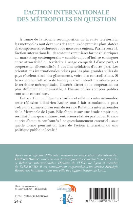 A l'aune de la récente recomposition de la carte territoriale, les métropoles sont devenues des acteurs de premier plan, dotées de compétences renforcées et de nouveaux enjeux. Parmi ceux-là, l'action internationale semble aujourd'hui se conjuguer entre attractivité du territoire à usage compétitif d'une part, et coopération décentralisée d'autre part. La présente étude pose sur le sujet un questionnement essentiel : sous quelle forme pourrait-on faire de l'action internationale une politique publique locale ?