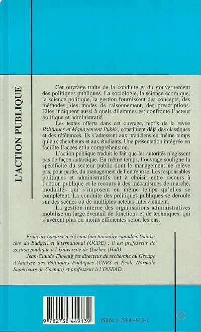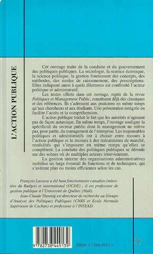 Cet ouvrage traite de la conduite et du gouvernement des politiques publiques. S'adressant aux praticiens comme aux chercheurs et aux étudiants, ces textes issus de la revue Politiques et Management Public soulignent les dilemmes auxquels est confronté l'acteur politique et administratif. Nous découvrons ainsi la gestion interne des organisations administratives, mobilisant un large éventail de fonctions et de techniques, qui s'avèrent plus ou moins efficientes selon les cas.