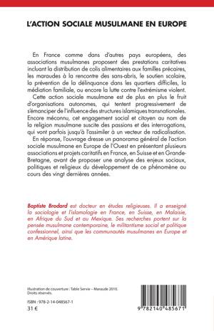 En France comme dans d'autres pays européens, des associations musulmanes proposent des prestations caritatives incluant la distribution de colis alimentaires aux familles précaires, les maraudes à la rencontre des sans-abris, le soutien scolaire, la prévention de la délinquance dans les quartiers difficiles, la médiation familiale, ou encore la lutte contre l'extrémisme violent. Cette action sociale musulmane est de plus en plus le fruit d'organisations autonomes, qui tentent progressivement de s'émanciper de l'influence des structures islamiques transnationales. Encore méconnu, cet engagement social et citoyen au nom de la religion musulmane suscite des passions et des interrogations, qui vont parfois jusqu'à l'assimiler à un vecteur de radicalisation. En réponse, l'ouvrage dresse un panorama général de l'action sociale musulmane en Europe de l'Ouest en présentant plusieurs associations et projets caritatifs en France, en Suisse et en Grande-Bretagne, avant de proposer une analyse des enjeux sociaux, politiques et religieux du développement de ce phénomène au cours des vingt dernières années.