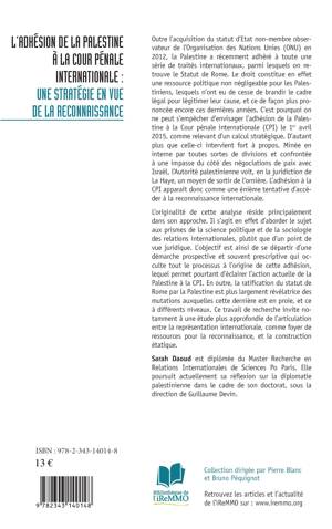 La Palestine a récemment adhéré à toute une série de traités internationaux. Le droit constitue une ressource politique non négligeable pour les Palestiniens, lesquels n'ont eu de cesse de brandir le cadre légal pour légitimer leur cause. L'adhésion de la Palestine à la CPI le 1er avril 2015 peut être envisagée comme un calcul stratégique face à l'impasse des négociations de paix avec Israël. L'auteure aborde le sujet aux prismes de la science politique et de la sociologie des relations internationales plutôt que d'un point de vue juridique.
