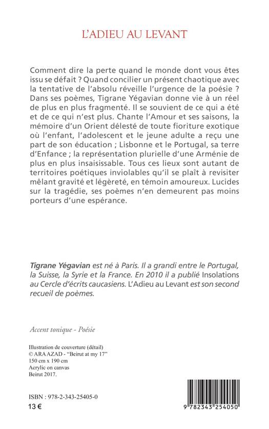 Comment dire la perte quand le monde dont vous êtes issu se défait ? Quand concilier un présent chaotique avec la tentative de l’absolu réveille l’urgence de la poésie ? Dans ses poèmes, Tigrane Yégavian donne vie à un réel de plus en plus fragmenté. Il se souvient de ce qui a été et de ce qui n’est plus. Chante l’Amour et ses saisons, la mémoire d’un Orient délesté de toute fioriture exotique où l’enfant, l’adolescent et le jeune adulte a reçu une part de son éducation ; Lisbonne et le Portugal, sa terre d’Enfance ; la représentation plurielle d’une Arménie de plus en plus insaisissable. Tous ces lieux sont autant de territoires poétiques inviolables qu’il se plaît à revisiter mêlant gravité et légèreté, en témoin amoureux. Lucides sur la tragédie, ses poèmes n’en demeurent pas moins porteurs d’une espérance.
