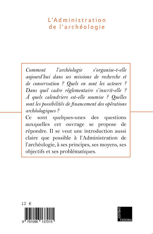 Comment l’archéologie s’organise-t-elle aujourd’hui dans ses missions de recherche et de conservation ? Quels en sont les acteurs ? Dans quel cadre réglementaire s’inscrit-elle ? À quels calendriers est-elle soumise ? Quelles sont les possibilités de financement des opérations archéologiques ? Ce sont quelques-unes des questions auxquelles cet ouvrage se propose de répondre. Il se veut une introduction aussi claire que possible à l’administration de l’archéologie, à ses principes, ses moyens, ses objectifs et ses problématiques.