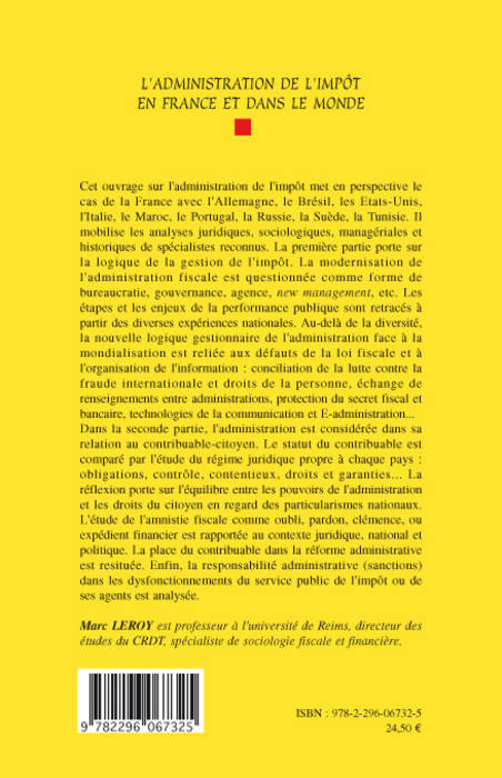 Voici une étude concernant l'administration de l'impôt en France, en Allemagne, au Brésil, aux Etats-Unis, en Italie, au Maroc, au Portugal, en Russie, Suède et Tunisie. Face à la mondialisation, la modernisation de cette administration est ici questionnée, ainsi que la relation contribuable-citoyen, tout en prenant en compte les particularismes nationaux. L'étude de l'amnistie fiscale ainsi que la responsabilité administrative des agents sont aussi abordées.