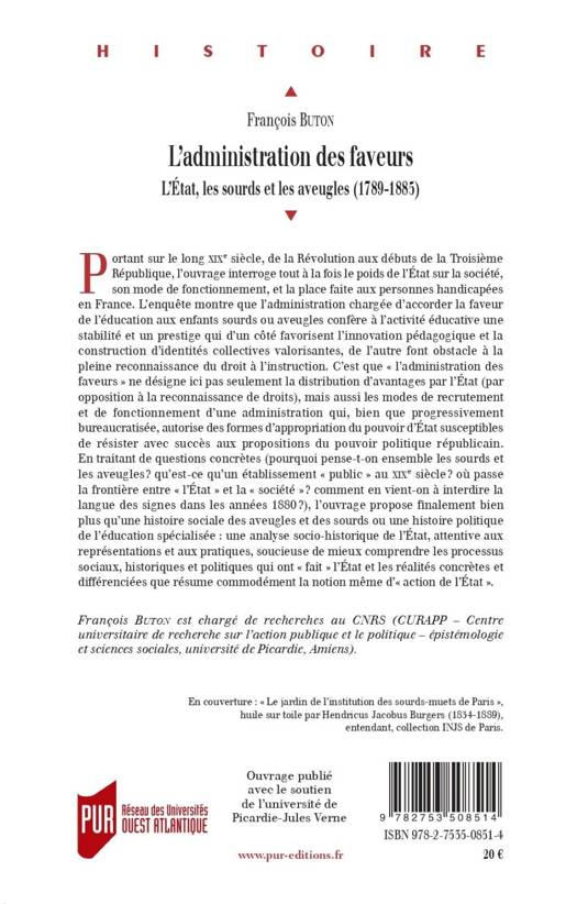 Portant sur le long XIXe siècle, de la Révolution aux débuts de la Troisième République, l’ouvrage interroge tout à la fois le poids de l’État sur la société, son mode de fonctionnement, et la place faite aux personnes handicapées en France. L’enquête montre que l’administration chargée d’accorder la faveur de l’éducation aux enfants sourds ou aveugles confère à l’activité éducative une stabilité et un prestige qui d’un côté favorisent l’innovation pédagogique et la construction d’identités collectives valorisantes, de l’autre font obstacle à la pleine reconnaissance du droit à l’instruction. C’est que « l’administration des faveurs » ne désigne ici pas seulement la distribution d’avantages par l’État (par opposition à la reconnaissance de droits), mais aussi les modes de recrutement et de fonctionnement d’une administration qui, bien que progressivement bureaucratisée, autorise des formes d’appropriation du pouvoir d’État susceptibles de résister avec succès aux propositions du pouvoir politique républicain. En traitant de questions concrètes (pourquoi pense-t-on ensemble les sourds et les aveugles ? qu’est-ce qu’un établissement « public » au XIXe siècle ? où passe la frontière entre « l’État » et la « société » ? comment en vient-on à interdire la langue des signes dans les années 1880 ?), l’ouvrage propose finalement bien plus qu’une histoire sociale des aveugles et des sourds ou une histoire politique de l’éducation spécialisée : une analyse socio-historique de l’État, attentive aux représentations et aux pratiques, soucieuse de mieux comprendre les processus sociaux, historiques et politiques qui ont « fait » l’État et les réalités concrètes et différenciées que résume commodément la notion même d’« action de l’État ».