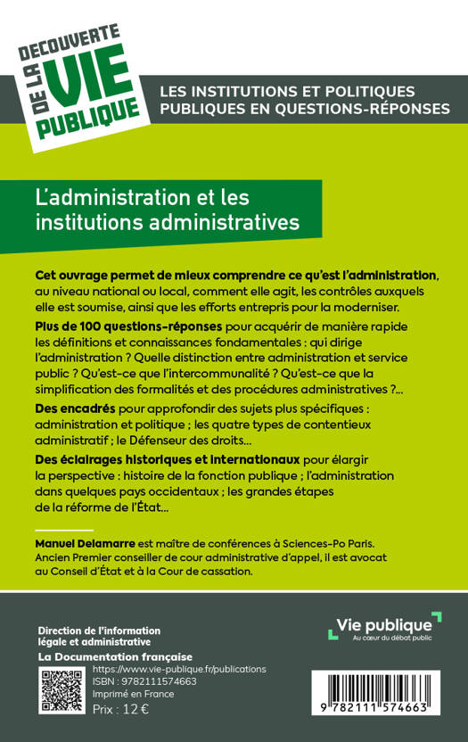 Cet ouvrage de synthèse explique de façon claire et précise le rôle de l’administration en France, ses structures, ses moyens d'action et son adaptation aux évolutions institutionnelles. Il précise et approfondit des notions clés comme administration et politique, service public, fonction publique, organisation territoriale : principes et limites, contrôle, autres structures administratives, agents de l'État, administration électronique.... Sous forme de questions-réponses il permet d’acquérir les connaissances fondamentales. Des éclairages historiques et internationaux mettent en perspective toutes ces informations.