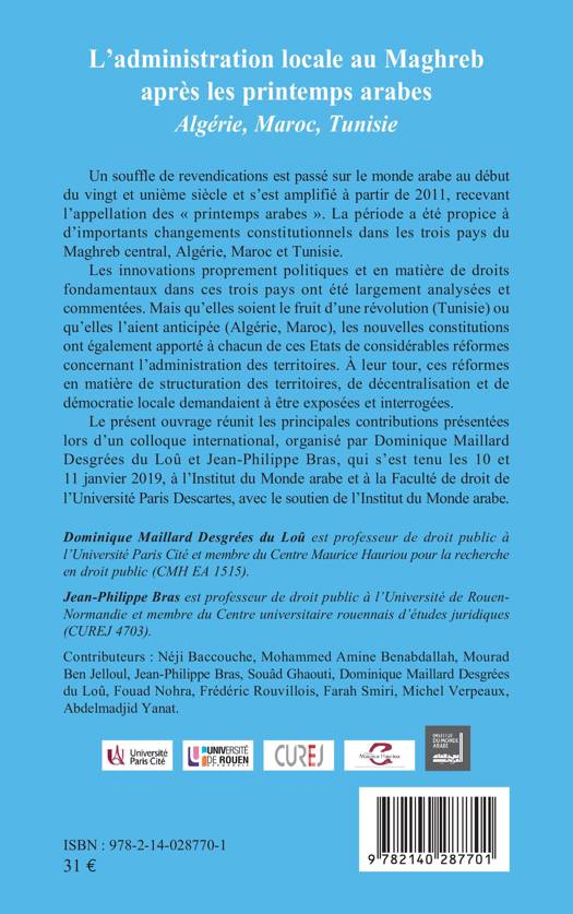 Un souffle de revendications est passé sur le monde arabe au début du vingt-et-unième siècle et s’est amplifié à partir de 2011, recevant l’appellation des « printemps arabes ». La période a été propice à d’importants changements constitutionnels dans les trois pays du Maghreb central, Algérie, Maroc et Tunisie. Les innovations proprement politiques et en matière de droits fondamentaux dans ces trois pays ont été largement analysées et commentées. Mais qu’elles soient le fruit d’une révolution (Tunisie) ou qu’elles l’aient anticipée (Algérie, Maroc), les nouvelles constitutions ont également apporté à chacun de ces Etats de considérables réformes concernant l’administration des territoires. À leur tour, ces réformes en matière de structuration des territoires, de décentralisation et de démocratie locale demandaient à être exposées et interrogées.