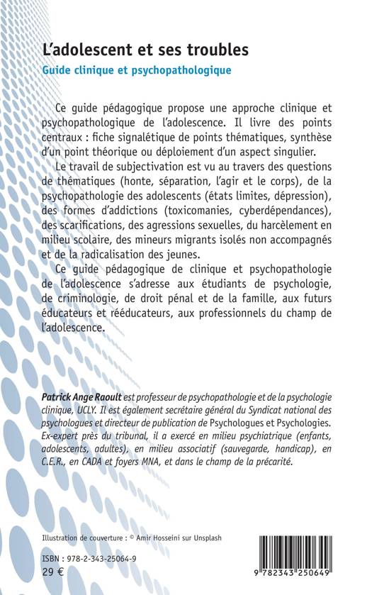 Ce guide pédagogique propose une approche clinique et psychopathologique de l'adolescence. Il livre des points centraux : fiche signalétique de points thématiques, synthèse d'un point théorique ou déploiement d'un aspect singulier. Le travail de subjectivation est vu au travers des questions de thématiques (honte, séparation, l'agir et le corps), de la psychopathologie des adolescents (états limites, dépression), des formes d'addictions (toxicomanies, cyberdépendances), des scarifications, des agressions sexuelles, du harcèlement en milieu scolaire, des mineurs migrants isolés non accompagnés et de la radicalisation des jeunes.