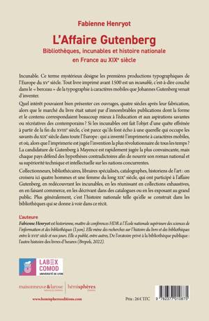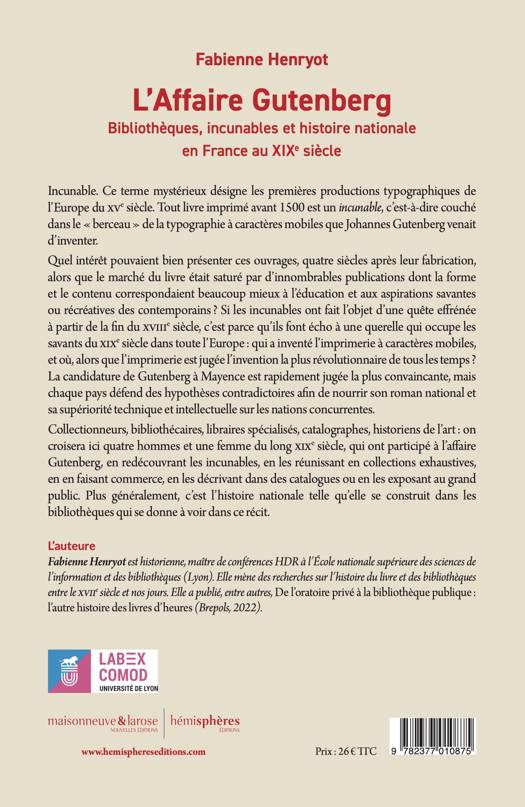Incunable. Ce terme mystérieux désigne les premièresproductions typographiques de l’Europe du XVe siècle. Tout livre imprimé avant1500 est un incunable, c’est-à-dire couché dans le « berceau » de la typographieà caractères mobiles que Johannes Gutenberg venait d’inventer. Quelintérêt pouvaient bien présenter ces ouvrages, quatre siècles après leurfabrication, alors que le marché du livre était saturé par d’innombrablespublications dont la forme et le contenu correspondaient beaucoup mieux àl’éducation et aux aspirations savantes ou récréatives des contemporains ? Siles incunables ont fait l’objet d’une quête effrénée à partir de la fin duxviiie siècle, c’est parce qu’ils font écho à une querelle qui occupe lessavants du XIXe siècle dans toute l’Europe : qui a inventé l’imprimerie àcaractères mobiles, et où, alors que l’imprimerie est jugée l’invention la plusrévolutionnaire de tous les temps ? La candidature de Gutenberg à Mayence estrapidement jugée la plus convaincante, mais chaque pays défend des hypothèsescontradictoires afin de nourrir son roman national et sa supériorité techniqueet intellectuelle sur les nations concurrentes. Collectionneurs,bibliothécaires, libraires spécialisés, catalographes, historiens de l’art : oncroisera ici quatre hommes et une femme du long xixe siècle, qui ont participé àl’affaire Gutenberg, en redécouvrant les incunables, en les réunissant encollections exhaustives, en en faisant commerce, en les décrivant dans descatalogues ou en les exposant au grand public. Plus généralement, c’estl’histoire nationale telle qu’elle se construit dans les bibliothèques qui sedonne à voir dans ce récit.