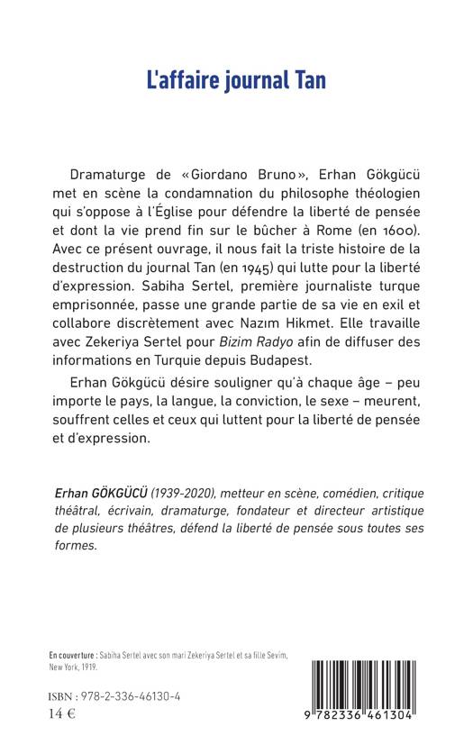 Dramaturge de Giordano Bruno, Erhan Gökgücü met en scène la condamnation du philosophe théologien qui s'oppose à l'Église pour défendre la liberté de pensée et dont la vie prend fin sur le bûcher à Rome (en 1600). Avec ce présent ouvrage, il nous fait la triste histoire de la destruction du journal Tan (en 1945) qui lutte pour la liberté d'expression. Sabiha Sertel, première journaliste turque emprisonnée, passe une grande partie de sa vie en exil et collabore discrètement avec Nazım Hikmet. Elle travaille avec Zekeriya Sertel pour Bizim Radyo afin de diffuser des informations en Turquie depuis Budapest. Erhan Gökgücü désire souligner qu'à chaque Âge - peu importe le pays, la langue, la conviction, le sexe - meurent, souffrent ceux et celles qui luttent pour la liberté de pensée et d'expression.