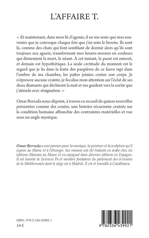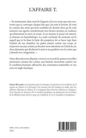 « Et maintenant, dans mon lit d’agonie, il ne me reste que mes souvenirs que je convoque chaque fois que j’en sens le besoin. Ils sont là, comme des chats qui font semblant de dormir alors qu’ils sont toujours aux aguets, transformant mes heures mornes en couleurs qui démentent la mort, le néant. À cet instant, le passé est enterré, et demain est hypothétique. La seule certitude du moment est le regard que je lis dans la fente des paupières de ce fauve tapi dans l’ombre de ma chambre, les pattes jointes contre son corps. Je n’éprouve aucune crainte, je focalise mon attention sur l’éclat de ses deux diamants qui déchirent la nuit et me guident vers la sortie que j’attends avec résignation. » Omar Berrada nous dépeint, à travers ce recueil de quinze nouvelles présentées comme des contes, une histoire récurrente centrée sur la condition humaine affranchie des contraintes matérielles et vue sous un angle mystique.
