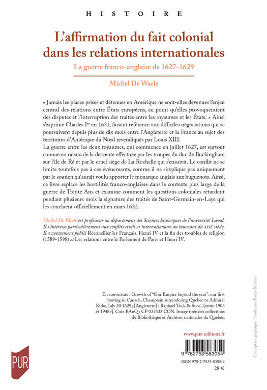 La guerre entre les deux royaumes, qui commence en juillet 1627, est surtout connue en raison de la descente effectuée par les troupes du duc de Buckingham sur l'île de Ré et par le cruel siège de La Rochelle qui s'ensuivit. Le conflit ne se limite toutefois pas à ces événements, comme il ne s'explique pas uniquement par le soutien qu'aurait voulu apporter le monarque anglais aux huguenots. Ainsi, ce livre replace les hostilités franco-anglaises dans le contexte plus large de la guerre de Trente Ans et examine comment les questions coloniales retardent pendant plusieurs mois la signature des traités de Saint-Germain-en-Laye qui les concluent officiellement en mars 1632.