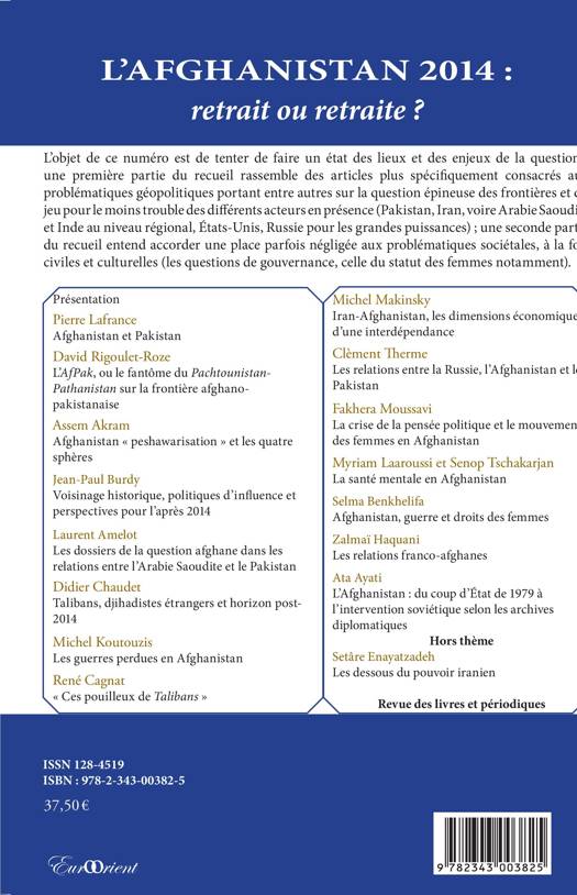 Cet état des lieux rassemble en première partie des articles consacrés aux problématiques géopolitiques portant sur la question épineuse des frontières et du jeu pour le moins trouble des différents acteurs en présence (Pakistan, Iran, voire Arabie saoudite et Inde, au niveau régional, Etats-Unis, Russie pour les grandes puissances) ; une seconde partie aborde les problématiques sociétales, à la fois civiles et culturelles (les questions de gouvernance, le statut des femmes)...