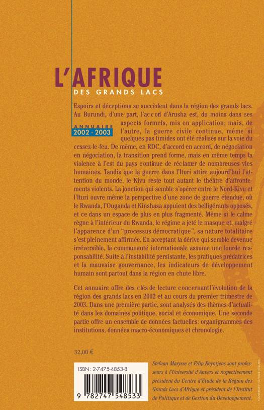 Cet annuaire offre des clés de lecture concernant l'évolution de la région des grands lacs en 2002 et au cours du premier trimestre de 2003. Dans une première partie, sont analysés des thèmes d'actualité dans les domaine politique, social et économique. Une seconde partie offre un exemple de données factuelles : organigrammes de institutions, données macro-économiques et chronologie.
