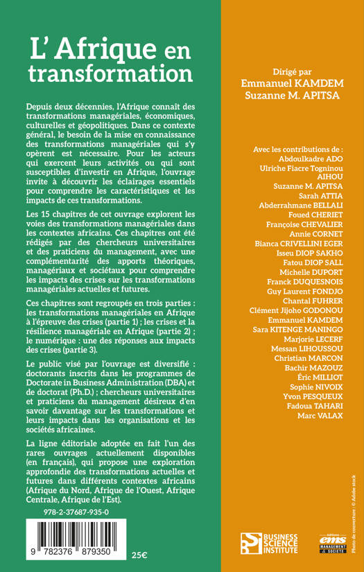 Les 15 chapitres de cet ouvrage explorent les voies des transformations managériales dans les contextes africains. Ces chapitres ont été rédigés par des chercheurs universitaires et des praticiens du management, avec une complémentarité des apports théoriques, managériaux et sociétaux pour comprendre les impacts des crises sur les transformations managériales actuelles et futures.
