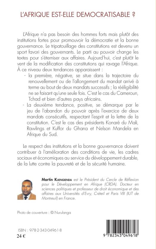L'Afrique n'a pas besoin d'hommes forts mais plutôt d'institutions fortes pour promouvoir la démocratie et la bonne gouvernance. Aujourd'hui, c'est la modification des constitutions qui ravage l'Afrique avec deux tendances distinctes : la conservation coute que coute du pouvoir ou la démocratisation. Le respect des institutions et la bonne gouvernance doivent contribuer à l'amélioration des conditions de vie, des cadres sociaux et économiques et de la lutte contre la pauvreté.