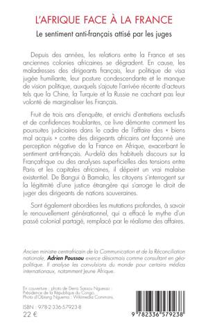 Depuis des années, les relations entre la France et ses anciennes colonies africaines se dégradent. En cause, les maladresses des dirigeants français, leur politique de visa jugée humiliante, leur posture condescendante et le manque de vision politique, auxquels s'ajoute l'arrivée récente d'acteurs tels que la Chine, la Turquie et la Russie ne cachant pas leur volonté de marginaliser les Français. Fruit de trois ans d'enquête, et enrichi d'entretiens exclusifs et de confidences troublantes, ce livre démontre comment les poursuites judiciaires dans le cadre de l'affaire des biens mal acquis contre des dirigeants africains ont façonné une perception négative de la France en Afrique, exacerbant le sentiment anti-français. Au-delà des habituels discours sur la Françafrique ou des analyses superficielles des tensions entre Paris et les capitales africaines, il dépeint un vrai malaise existentiel. De Bangui à Bamako, les citoyens s'interrogent sur la légitimité d'une justice étrangère qui s'arroge le droit de juger des dirigeants de nations souveraines. Sont également abordées les mutations profondes, à savoir le renouvellement générationnel, qui a effacé le mythe d'un passé colonial partagé, remplacé par le réalisme des affaires.