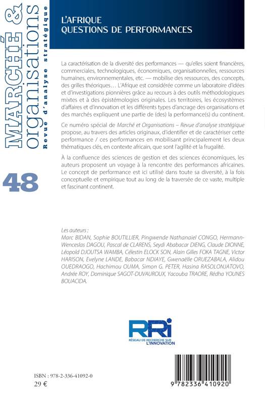 La caractérisation de la diversité des performances - qu'elles soient financières, commerciales, technologiques, économiques, organisationnelles, ressources humaines, environnementales, etc. - mobilise des ressources, des concepts, des grilles théoriques... L'Afrique est considérée comme un laboratoire d'idées et d'investigations pionnières grâce au recours à des outils méthodologiques mixtes et à des épistémologies originales. Les territoires, les écosystèmes d'affaires et d'innovation et les différents types d'ancrage des organisations et des marchés expliquent une partie de (des) la performance(s) du continent. Ce numéro spécial de Marché et Organisations propose, au travers des articles originaux, d'identifier et de caractériser cette performance / ces performances en mobilisant principalement les deux thématiques clés, en contexte africain, que sont l'agilité et la frugalité. À la confluence des sciences de gestion et des sciences économiques, les auteurs proposent un voyage à la rencontre des performances africaines. Le concept de performance est ici utilisé dans toute sa diversité, à la fois conceptuelle et empirique tout au long de la traversée de ce vaste, multiple et fascinant continent.