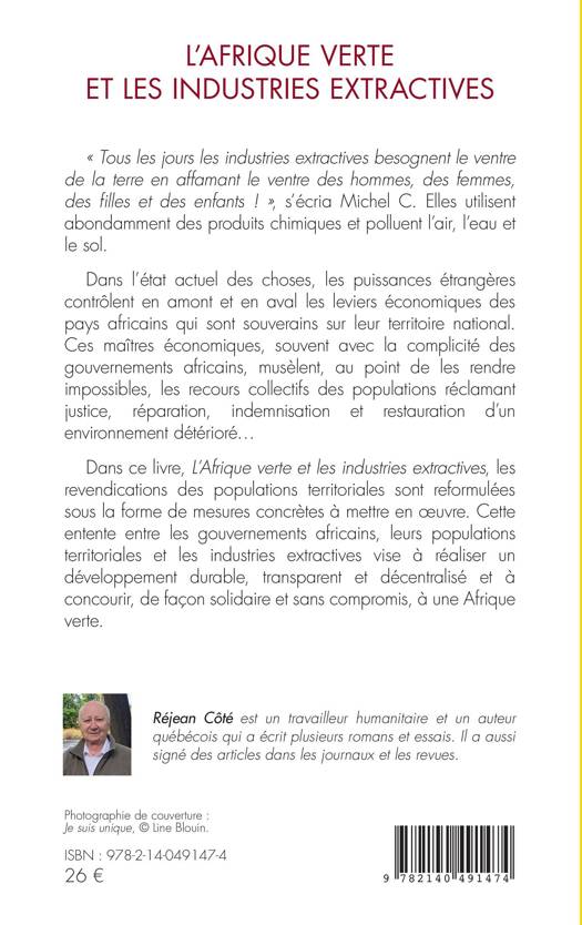 « Tous les jours les industries extractives besognent le ventre de la terre en affamant le ventre des hommes, des femmes, des filles et des enfants ! », s'écria Michel C. Elles utilisent abondamment des produits chimiques et polluent l'air, l'eau et le sol. Dans l'état actuel des choses, les puissances étrangères contrôlent en amont et en aval les leviers économiques des pays africains qui sont souverains sur leur territoire national. Ces maîtres économiques, souvent avec la complicité des gouvernements africains, musèlent, au point de les rendre impossibles, les recours collectifs des populations réclamant justice, réparation, indemnisation et restauration d'un environnement détérioré… Dans ce livre, les revendications des populations territoriales sont reformulées sous la forme de mesures concrètes à mettre en oeuvre. Cette entente entre les gouvernements africains, leurs populations territoriales et les industries extractives vise à réaliser un développement durable, transparent et décentralisé et à concourir, de façon solidaire et sans compromis, à une Afrique verte.