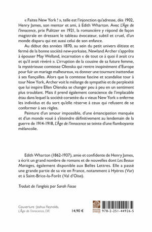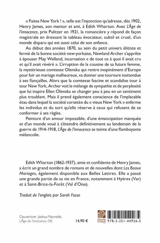 Faites New York ! , telle est l'injonction qu'adresse, des 1902, Henry James, son mentor et ami, a Edith Wharton. Avec L'Age de l'innocence, prix Pulitzer en 1921, la romanciere y repond de facon magistrale en dressant le tableau evocateur, subtil et cruel, d'un monde disparu qui est aussi celui de son enfance. Au debut des annees 1870, au sein du petit univers elitiste et ferme de la bonne societe new-yorkaise, Newland Archer s'apprete a epouser May Welland, incarnation de tout ce a quoi il avait cru et qu'il avait revere . L'irruption de la cousine de sa future femme, la mysterieuse comtesse Olenska qui rentre inopinement d'Europe pour fuir un mariage malheureux, va donner une tournure inattendue a ses fiancailles. Alors que la comtesse fascine et scandalise tour a tour New York, Archer voit le melange de sympathie et de perplexite que lui inspire Ellen Olenska se changer peu a peu en un sentiment plus troublant. Mais il prend egalement conscience de l'implacable etau dans lequel la societe corsetee du vieux New York enferme les individus et du sort qu'elle reserve a ceux qui refusent de se conformer a ses regles. Peinture d'un amour impossible, d'une emancipation manquee et d'un monde voue a s'eteindre definitivement au lendemain de la guerre de 1914-1918, L'Age de l'innocence se teinte d'une flamboyante melancolie.