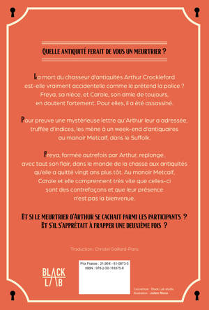 La mort du chasseur d’antiquités Arthur Crockleford est-elle vraiment accidentelle comme le prétend la police  ? Freya, sa disciple, et Carole, son amie de toujours, en doutent fortement. Pour elles, il a été assassiné. Pour preuve une mystérieuse lettre qu’Arthur leur a adressée, truffée d’indices, les mène à un week-end d’antiquaires au manoir Copthorn, dans le Suffolk.