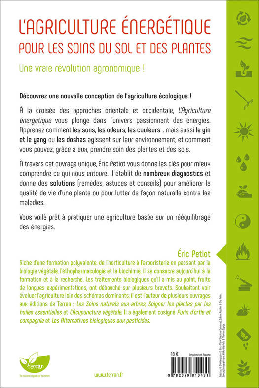 À travers cet ouvrage unique, Éric Petiot vous donne les clés pour mieux comprendre ce qui nous entoure. Il établit de nombreux diagnostics et donne des solutions (remèdes, astuces et conseils) pour améliorer la qualité de vie d’une plante ou pour lutter de façon naturelle contre les maladies. Vous voilà prêt à pratiquer une agriculture basée sur un rééquilibrage des énergies.