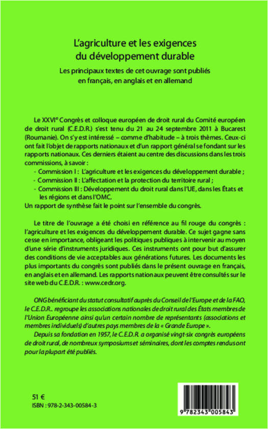 L'agriculture et les exigences du développement durable, l'affectation et la protection du territoire rural et enfin le développement du droit rural dans l'UE, dans les Etats et les régions et dans l'OMC : ces trois thèmes autour de l'agriculture et les exigences du développement durable gagnent en importance, obligeant les politiques publiques à intervenir au moyen d'une série d'instruments juridiques. (Ouvrage en trois langues).