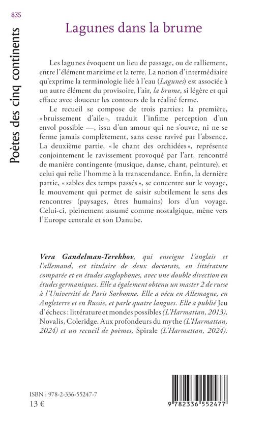 Les lagunes évoquent un lieu de passage, ou de ralliement, entre l'élément maritime et la terre. La notion d'intermédiaire qu'exprime la terminologie liée à l'eau (Lagunes) est associée à un autre élément du provisoire, l'air, la brume, si légère et qui efface avec douceur les contours de la réalité ferme. Le recueil se compose de trois parties; la première, bruissement d'aile, traduit l'infime perception d'un envol possible -, issu d'un amour qui ne s'ouvre, ni ne se ferme jamais complètement, sans cesse ravivé par l'absence. La deuxième partie, le chant des orchidées, représente conjointement le ravissement provoqué par l'art, rencontré de manière contingente (musique, danse, chant, peinture), et celui qui relie l'homme à la transcendance. Enfin, la dernière partie, sables des temps passés, se concentre sur le voyage, le mouvement qui permet de saisir subtilement le sens des rencontres (paysages, êtres humains) lors d'un voyage. Celui-ci, pleinement assumé comme nostalgique, mène vers l'Europe centrale et son Danube.
