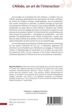 Les ouvrages sur la pratique des arts martiaux, y compris ceux sur l’aïkido, proposent généralement des descriptions de formes codifiées, de normes ou d’idéaux martiaux, philosophiques, que les pratiquants sont censés rechercher ou atteindre. Le présent ouvrage se situe dans une perspective différente. En partant d’une analyse détaillée de vidéos enregistrées au Japon dans un dojo d’aïkido, il démontre que l’aïkido fonctionne comme un langage des corps en interaction et repose sur une syntaxe du mouvement corporel. Ce livre présente les caractéristiques de cette syntaxe du mouvement — anticipation et simultanéité — qui rend possible l’accomplissement d’une infinité d’interactions, chaque jour dans les dojos d’aïkido de la planète. Le livre s’arrête sur les dimensions spatio-temporelles de cette syntaxe et sur son apprentissage.
