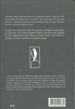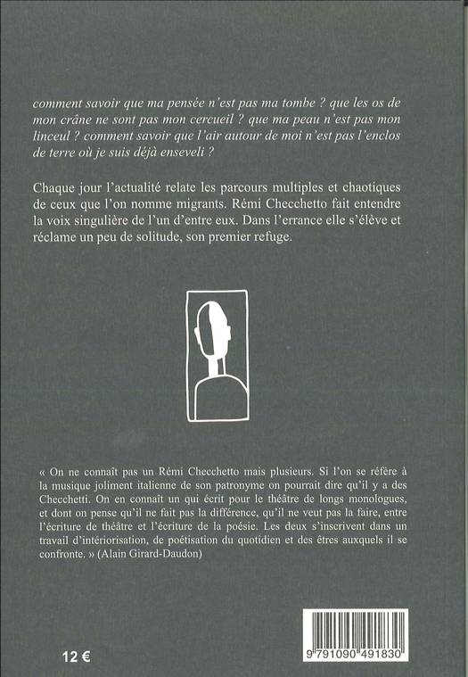Chaque jour l'actualité relate les parcours multiples et chaotiques de ceux que l'on nomme migrants. Rémi Checchetto fait entendre la voix singulière de l'un d'entre eux. Dans l'errance elle s'élève et réclame un peu de solitude, son premier refuge.