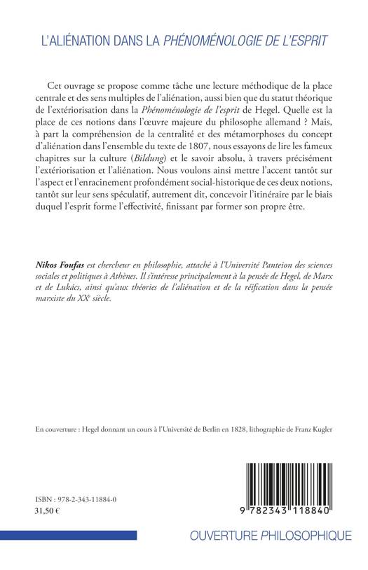 Cet ouvrage propose une lecture méthodique de la place centrale et des sens multiples de l'aliénation et de l'extériorisation dans la Phénoménlogoie de l'esprit de Hegel. Quelle est la place de ces notions dans l'oeuvre majeure du philosophe allemand ? L'auteur tente ainsi de mettre l'accent tantôt sur l'aspect et l'enracinement profondément social-historique de ces deux notions.