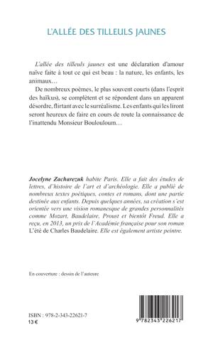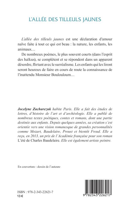 L’allée des tilleuls jaunes est une déclaration d’amour naïve faite à tout ce qui est beau : la nature, les enfants, les animaux...De nombreux poèmes, le plus souvent courts (dans l’esprit des haïkus), se complètent et se répondent dans un apparent désordre, flirtant avec le surréalisme. Les enfants qui les liront seront heureux de faire en cours de route la connaissance de l’inattendu Monsieur Boulouloum...