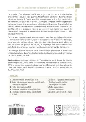 Le premier État allemand unifié voit le jour en 1871 sous la domination prussienne à l’issue de trois guerres. Mais l’histoire allemande du xixe siècle est loin de se résumer à l’unité, au militarisme prussien et à la figure autoritaire de Bismarck. Au cours de ce siècle, l’Allemagne s’impose comme la première puissance économique européenne, elle est aussi le premier État social et un pays où intellectuels et artistes produisent des œuvres qui font référence. Les conflits politiques et sociaux violents qui secouent l’Allemagne sont autant de moments où s’inventent et s’établissent des formes spécifiques de démocratie politique et sociale.