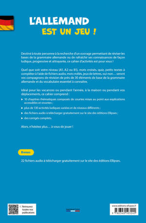 Ce cahier d’activités est destiné à toute personne à la recherche d’un ouvrage permettant de réviser les bases de la grammaire allemande ou de rafraîchir ses connaissances de façon ludique, progressive et attrayante.