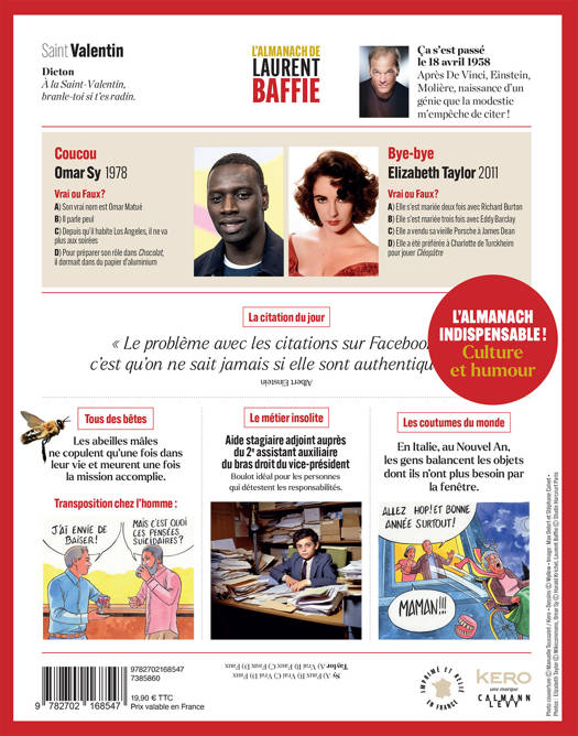 Laurent Baffie vous présente son almanach ! À chaque jour son saint, son dicton, un quiz, un chiffre, des infos, du rire… 365 jours d’humour et de culture.