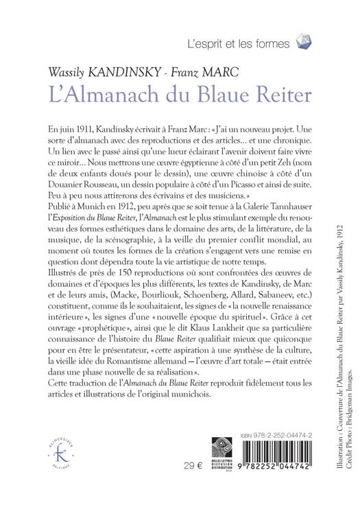 En juin 1911, Kandinsky ecrivait a Franz Marc: J'ai un nouveau projet. Une sorte d'almanach avec des reproductions et des articles... et une chronique. Un lien avec le passe ainsi qu'une lueur eclairant l'avenir doivent faire vivre ce miroir... Nous mettrons une oeuvre egyptienne a cote d'un petit Zeh (nom de deux enfants doues pour le dessin), une oeuvre chinoise a cote d'un Douanier Rousseau, un dessin populaire a cote d'un Picasso et ainsi de suite. Peu a peu nous attirerons des ecrivains et des musiciens. Publie a Munich en 1912, peu apres que se soit tenue a la Galerie Tannhauser l'Exposition du Blaue Reiter^, l'Almanach est le plus stimulant exemple du renouveau des formes esthetiques dans le domaine des arts, de la litterature, de la musique, de la scenographie, a la veille du premier conflit mondial, au moment ou toutes les formes de la creation s'engagent vers une remise en question dont dependra toute la vie artistique de notre temps. Illustres de pres de 150 reproductions ou sont confrontees des oeuvres de domaines et d'epoques les plus differents, les textes de Kandinsky, de Marc et de leurs amis, (Macke, Bourliouk, Schoenberg, Allard, Sabaneev, etc.) constituent, comme ils le souhaitaient, les signes de la nouvelle renaissance interieure , les signes d'une nouvelle epoque du spirituel . Grace a cet ouvrage prophetique , ainsi que le dit Klaus Lankheit que sa particuliere connaissance de l'histoire du Blaue Reiter qualifiait mieux que quiconque pour en etre le presentateur, cette aspiration a une synthese de la culture, la vieille idee du Romantisme allemand - l'oeuvre d'art totale - etait entree dans une phase nouvelle de sa realisation . Cette traduction de l'Almanach du Blaue Reiter reproduit fidelement tous les articles et illustrations de l'original munichois.