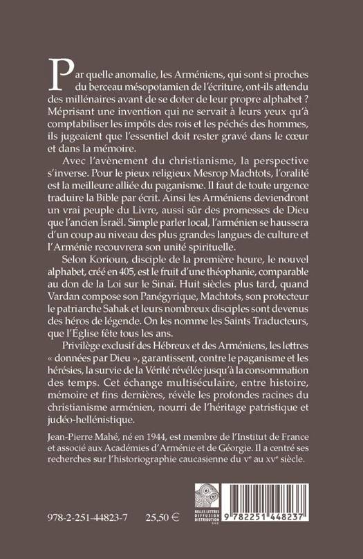 Par quelle anomalie, les Armeniens, qui sont si proches du berceau mesopotamien de l'ecriture, ont-ils attendu des millenaires avant de se doter de leur propre alphabet ? Meprisant une invention qui ne servait a leurs yeux qu'a comptabiliser les impots des rois et les peches des hommes, ils jugeaient que l'essentiel doit rester grave dans le coeur et dans la memoire. Avec l'avenement du christianisme, la perspective s'inverse. Pour le pieux religieux Mesrop Machtots, l'oralite est la meilleure alliee du paganisme. Il faut de toute urgence traduire la Bible par ecrit. Ainsi les Armeniens deviendront un vrai peuple du Livre, aussi sur des promesses de Dieu que l'ancien Israel. Simple parler local, l'armenien se haussera d'un coup au niveau des plus grandes langues de culture et l'Armenie recouvrera son unite spirituelle. Selon Korioun, disciple de la premiere heure, le nouvel alphabet, cree en 405, est le fruit d'une theophanie, comparable au don de la Loi sur le Sinai. Huit siecles plus tard, quand Vardan compose son Panegyrique, Machtots, son protecteur le patriarche Sahak et leurs nombreux disciples sont devenus des heros de legende. On les nomme les Saints Traducteurs, que l'Eglise fete tous les ans. Privilege exclusif des Hebreux et des Armeniens, les lettres donnees par Dieu , garantissent, contre le paganisme et les heresies, la survie de la Verite revelee jusqu'a la consommation des temps. Cet echange multiseculaire, entre histoire, memoire et fins dernieres, revele les profondes racines du christianisme armenien, nourri de l'heritage patristique et judeo-hellenistique.