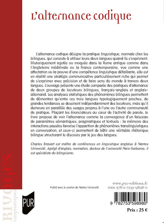 L’alternance codique désigne la pratique linguistique, normale chez les bilingues, qui consiste à utiliser leurs deux langues quand ils s’expriment. Historiquement rejetée ou moquée dans la Rome antique comme dans l’Angleterre médiévale ou la France contemporaine, vue comme une affectation ou la preuve d’une compétence linguistique défaillante, elle est en réalité une stratégie communicative particulièrement riche qui permet de s’exprimer avec précision et de faire sens du monde à travers deux langues. L’ouvrage présente une étude comparée des pratiques d’alternance de deux groupes de locuteurs bilingues, français-anglais et anglais-allemand. Les analyses statistiques des phénomènes bilingues permettent de démontrer qu’entre ces trois langues typologiquement proches, de grandes tendances se dessinent indépendamment des locuteurs, mais qu’il demeure en parallèle des usages propres à l’une ou l’autre communauté de pratique. Plaçant les énonciateurs au coeur de l’activité de parole, le livre propose de voir l’alternance comme la convergence d’un faisceau de paramètres sémantiques, pragmatiques et textuels : la mémoire des interactions passées favorise l’apparition de phénomènes translinguistiques en conversation, et ceux-ci permettent de bâtir une véritable rhétorique bilingue structurant le discours par le jeu des langues.