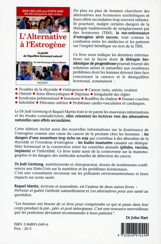 De plus en plus de femmes cherchent des alternatives aux hormones synthétiques et leurs effets secondaires trop souvent néfastes. Et pourtant, malgré certains dangers de la thérapie traditionnelle de remplacement par des hormones (TRH), la sur-ordonnance d'estrogène sévit encore, tout comme la confusion entre les médecins et les patients sur l'emploi bénéfique ou non de la TRH. Ce livre nous indique les dernières informations sur la façon dont la thérapie bioidentique de progestérone pourrait fournir des solutions saines et naturelles aux nombreux problèmes dont les femmes doivent faire face concernant la carence et le déséquilibre hormonal, notamment : Troubles de la thyroïde, Ostéoporose, Cancer (sein, utérin, ovaires), Obésité, Seins fibrocystiques, Déprime, Irrégularité des règles, Syndrome prémenstruel, Insomnie, Bouffées de chaleur, Fausses couches, Infertilité, Fibromes utérins, Problèmes cardio-vasculaires et cardiaques. Le Dr Judi Gerstung et Raquel Martin font le tri parmi les mauvaises informations et les études contradictoires, elles orientent les lectrices vers des alternatives naturelles sans effets secondaires. Cette édition inclut aussi des nouvelles informations sur la dominance de l'estrogène comme une cause du cancer de la prostate chez les hommes ; les dangers d'une nourriture trop riche en soja qui contribue à des désordres de la thyroïde et l'overdose d'estrogène ; les huiles insaturées causant un déséquilibre hormonal et la connexion entre les contrôles annuels (pilules, vaccins, implants) et l'infertilité. Ce livre traite aussi de la controverse sur la mammographie et les dangers des méthodes actuelles de détection du cancer.