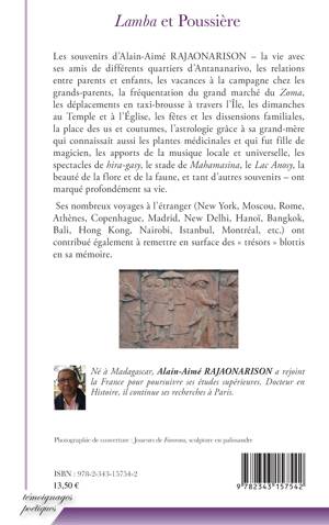 Les souvenirs d'Alain-Aimé RAJAONARISON - la vie avec ses amis de différents quartiers d'Antananarivo, les relations entre parents et enfants, les vacances à la campagne chez les grands-parents, la fréquentation du grand marché du Zoma, les déplacements en taxi-brousse à travers l'Île, les dimanches au Temple et à l'Église, le stade de Mahamasina, ses nombreux voyages à l'étrangers, et tant d'autres souvenirs - ont marqué profondément sa vie. Cet ouvrage remet en surface ces « trésors » blottis en sa mémoire.