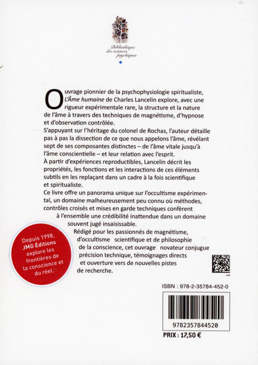 Ouvrage pionnier de la psychophysiologie spiritualiste, L’Âme humaine de Charles Lancelin explore, avec une rigueur expérimentale rare, la structure et la nature de l’âme à travers des techniques de magnétisme, d’hypnose et d’observation contrôlée. S’appuyant sur l’héritage du colonel de Rochas, l’auteur détaille pas à pas la dissection de ce que nous appelons l’âme, révélant sept de ses composantes distinctes – de l’âme vitale jusqu’à l’âme conscientielle – et leur relation avec l’esprit. À partir d’expériences reproductibles, Lancelin décrit les propriétés, les fonctions et les interactions de ces éléments subtils en les replaçant dans un cadre à la fois scientifique et spiritualiste. Ce livre offre un panorama unique sur l’occultisme expérimental, un domaine malheureusement peu connu où méthodes, contrôles croisés et mises en garde techniques confèrent à l’ensemble une crédibilité inattendue dans un domaine souvent jugé insaisissable. Rédigé pour les passionnés de magnétisme, d’occultisme scientifique et de philosophie de la conscience, cet ouvrage novateur conjugue précision technique, témoignages directs et ouverture vers de nouvelles pistes de recherche.