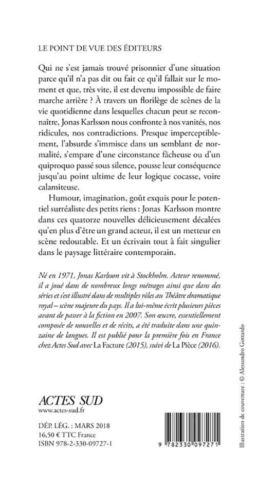Qui ne s'est jamais trouvé prisonnier d'une situation parce qu'il n'a pas dit ou fait ce qu'il fallait sur le moment et que, très vite, il est devenu impossible de faire marche arrière ? À travers un florilège de scènes de la vie quotidienne dans lesquelles chacun peut se reconnaître, Jonas Karlsson nous confronte à nos vanités, nos ridicules, nos contradictions. Presque imperceptiblement, l'absurde s'immisce dans un semblant de normalité, s'empare d'une circonstance fâcheuse ou d'un quiproquo passé sous silence, pousse leur conséquence jusqu'au point ultime de leur logique cocasse, voire calamiteuse. Humour, imagination, goût exquis pour le potentiel surréaliste des petits riens : Jonas Karlsson montre dans ces quatorze nouvelles délicieusement décalées qu'en plus d'être un grand acteur, il est un metteur en scène redoutable. Et un écrivain tout à fait singulier dans le paysage littéraire contemporain.