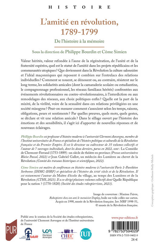 Valeur héritée, valeur refondée à l’aune de la régénération, de l’unité et de la fraternité espérées, quel est le statut de l’amitié dans les projets républicains et les communautés utopiques ? Que deviennent dans la Révolution la culture salonnière et l’idéal maçonniques qui reposent ô combien sur l’entrelacs des relations individuelles ? Comment se nouent, se dénouent ou, au contraire, résistent sur le long terme, les solidarités amicales (dont la camaraderie scolaire ou estudiantine, le compagnonnage professionnel, les réseaux familiaux hérités) confrontées aux événements révolutionnaires ou contre-révolutionnaires, à l’interdiction ou aux remodelages des réseaux, aux choix politiques enfin ? Quelle est la part de la mixité, de la virilité, voire de la sexualité dans ces relations privilégiées en une société misogyne ? Peut-on mesurer comment s’associent selon les temps, raisons, obligations, peurs et sentiments ? Par quelles preuves, quels mots, quels gestes, se déclare et vit une relation amicale? Dans le sillage ouvert par l’histoire des émotions et des sensibilités, il s’agit ici d’apporter de nouvelles réponses et de nouveaux éclairages.