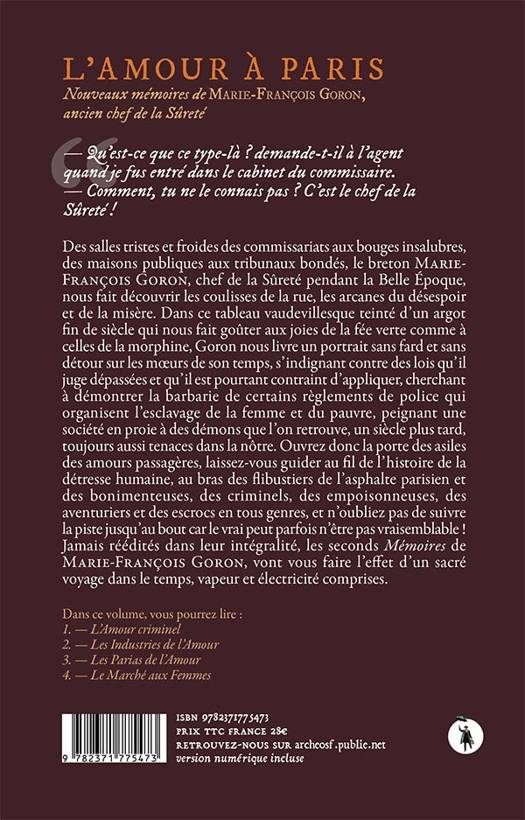Des salles tristes et froides des commissariats aux bouges insalubres, des maisons publiques aux tribunaux bondés, le breton Marie-François Goron, chef de la Sûreté pendant la Belle Époque, nous fait découvrir les coulisses de la rue, les arcanes du désespoir et de la misère. Dans ce tableau vaudevillesque teinté d’un argot fin de siècle qui nous fait goûter aux joies de la fée verte comme à celles de la morphine, Goron nous livre un portrait sans fards et sans détour sur les moeurs de son temps, s’indignant contre des lois qu’il juge dépassées et qu’il est pourtant contraint d’appliquer, cherchant à démontrer la barbarie de certains règlements de police qui organisent l’esclavage de la femme et du pauvre, peignant une société en proie à des démons que l’on retrouve, un siècle plus tard, toujours aussi tenaces dans la nôtre. Ouvrez donc la porte des asiles des amours passagères, laissez-vous guider au fil de l’histoire de la détresse humaine, au bras des flibustiers de l’asphalte parisien et des bonimenteuses, des criminels, des empoisonneuses, des aventuriers et des escrocs en tous genres, et n’oubliez pas de suivre la piste jusqu’au bout car le vrai peut parfois n’être pas vraisemblable ! Jamais réédités dans leur intégralité, les seconds Mémoires de Marie-François Goron, vont vous faire l’effet d’un sacré voyage dans le temps, vapeur et électricité comprises. Dans ce volume, vous pourrez lire : 1. — L’Amour criminel 2. — Les Industries de l’Amour 3. — Les Parias de l’Amour 4. — Le Marché aux Femmes