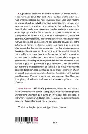 Ce grand livre posthume d'Allan Bloom part d'un constat anxieux: le lien humain se defait. Non par l'effet de quelque fatalite exterieure, mais simplement parce que nous le voulons ainsi: nous nous voulons de plus en plus des individus libres et authentiques , eh bien, nous avons ce que vous voulons, nous avons, au lieu de l'amour ou de l'amitie, des relations sexuelles ou des relations amicales . Alors le projet d'Allan Bloom est de retrouver la complexite, les triomphes et les echecs - bref, la verite - du lien humain, amoureux et amical. Comment ? En lui redonnant la parole, par une exploration merveilleusement ample et libre des grandes oeuvres de notre culture, ou l'amour et l'amitie ont trouve leurs expressions les plus splendides, les plus convaincantes - ou les plus troublantes. Rousseau, Shakespeare et Platon sont les trois grandes etapes de cette redecouverte ou il nous est finalement montre comment, et en quel sens, la recherche commune et l'amour de la sagesse peuvent constituer la plus haute possibilite de l'ame et former le lien humain le plus fort parce que le plus veridique. C'est peu de dire que l'auteur porte legerement sa science. Il se meut avec autorite et agilite dans l'immense etendue de notre empire interieur. C'est un assez beau roman que celui de la nature humaine , ecrit quelque part Rousseau. C'est ce roman-la que nous propose Allan Bloom, et il est plus profondement interessant et emouvant qu'aucun roman d'amour.