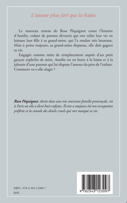 Le nouveau roman de Rose Péquignot conte l'histoire d'Aurélie, enfant de parents divorcés qui ont refait leur vie en laissant leur fille à sa grand-mère, qui l'a rendue très heureuse. Mais à peine majeure, sa grand-mère disparue, elle doit gagner sa vie. Engagée comme mère de remplacement auprès d'un petit garçon orphelin de mère, Aurélie est en butte à la haine et à la jalousie d'une parente qui lui dispute l'amour du père de l'enfant. Comment va-t-elle réagir ?
